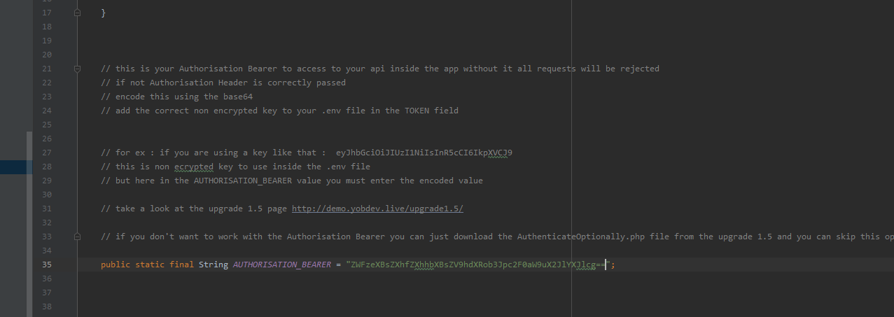 enter any words you like is prefered to use a string generator after that open https://www.base64encode.org/ Encrypt the key like ( Your Main Server Api) then paste it into the AUTHORISATION_BEARER value in Constants.java Now Open your .env file and edit the TOKEN value (Must be the same as your android value) for the token value in the .env use the real value not the encoded In case you want to work with that you can use the